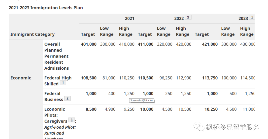 其中经济类移民的2021年的目标为232,500万(最低18.05万,最高23.7万)。涵盖范围包括: