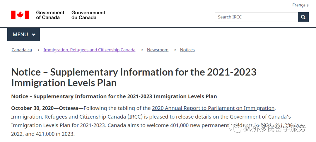 2020年10月30号,加拿大公布了2021-2023年接收移民的计划,将把移民目标定在其历史上的最高水平。
