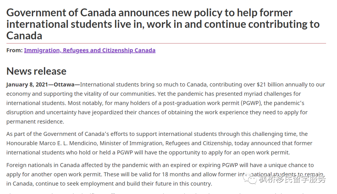2021年1月8号,加拿大移民局官网公布:符合条件的持有毕业工签或者曾经持有毕业工签的毕业生,可以申请新的开放式工签。former international students who hold or held a PGWP will have the opportunity to apply for an open work permit.