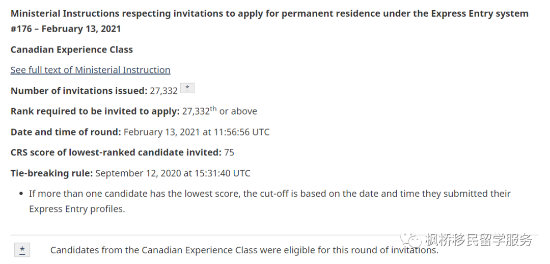 石破天惊!2021年2月13号,农历年初二。加拿大移民局发布公告,以75分的低分,发放27332份移民邀请函,邀请在2020年9月12号之后的加拿大经验类移民邀请人!