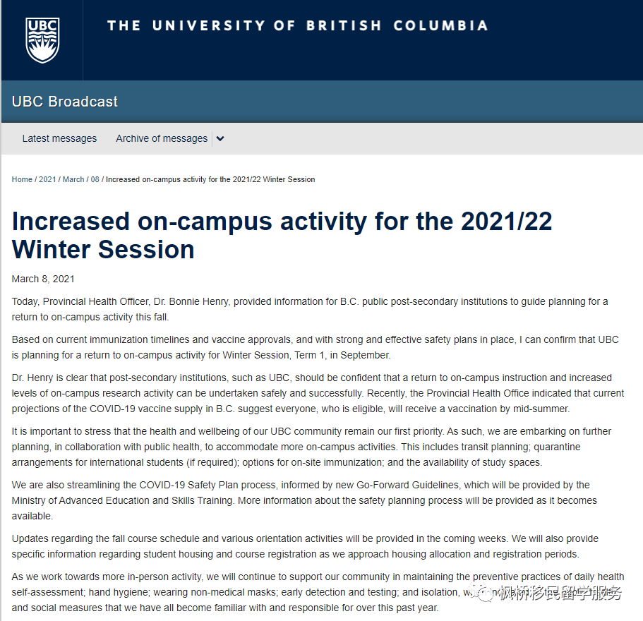 UBC大学校长Santa J. Ono在一份声明中表示,学校期待看到UBC师生回归,使我们的校园再次充满活力。UBC大学为了能安全地容纳更多的人在校园里。UBC将继续与公共卫生官员合作,制定安全计划,包括交通规划和国际学生的隔离安排。
