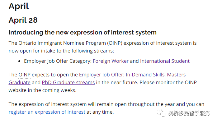 2021年4月28号,加拿大安省省提名官网宣布安省移民意愿表达系统EOI正式launch on上线。想要申请安省雇主担保中的海外技术移民和国际留学生,都支棱起来放心申请吧!